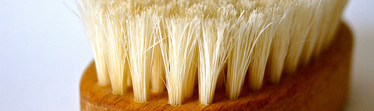 Trockenbürsten ist wirklich hocheffektiv. Bürstet Sie vor dem Duschen die trockene Haut mit einer trockenen Bürste. Das entfernt abgestorbene Hautschüppchen, regt die Durchblutung an und fördert die Zellerneuerung.