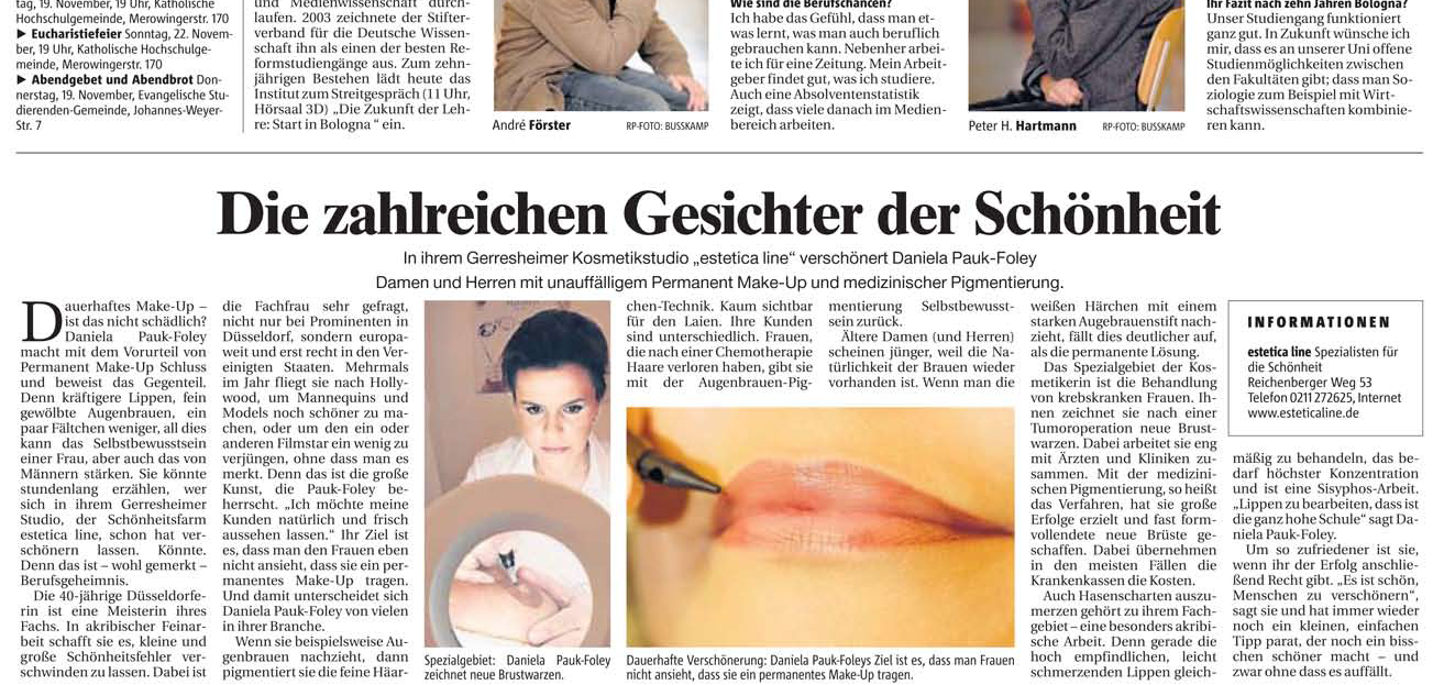 Dauerhaftes Make-up - ist das nicht schädlich? Daniela Pauk-Foley macht mit dem Vorurteil von Permanent Make-up Schluss und beweist das Gegenteil. Denn kräftigere Lippen, fein gewölbte Augenbrauen, ein paar Fältchen weniger, all dies kann das Selbstbewusstsein einer Frau, aber auch das von Männern stärken. SIe könnte stundenlang erzählen, wer sich in ihrem Gerresheimer Studio, der Schönheitsfarm estetica line, schon hat verschönern lassen. Könnte. Denn das ist - wohl gemerkt - Berufsgeheimnis. Die 40-jährige Düsseldorferin ist eine Meisterin ihres Fachs. In akribischer Feinarbeit schafft sie es, kleine und große Schönheitsfehler verschwinden zu lassen. Dabei ist die Fachfrau sehr gefragt, nicht nur bei Prominenten in Düsseldorf, sondern europaweit und erst recht in den Vereinigten Staaten. Mehrmals im Jahr fliegt sie nach Hollywood, um Mannequins und Models noch schöner zu machen, oder um den ein oder anderen Filmstar ein wenig zu verjüngen, ohne dass man es merkt. Denn das ist die große Kunst, die Pauk-Foley beherrscht. "ich möchte meine Kunden natürlich und frisch aussehen lassen." Ihr Ziel ist es, dass man den Frauen eben nicht ansieht, dass sie ein permanentes Make-up tragen. Und damit unterscheidet sich Daniela Pauk-Foley von vielen in ihrer Branche. Wenn sie beispielsweise Augenbrauen nachzieht, dann pigmentiert sie die feine Häarchen-Technik. Kaum sichtbar für den Laien. Ihre Kunden sind unterschiedlich. Frauen, die nach einer Chemotherapie Haare verloren haben, gibt sie mit der Augenbrauen-Pigmentierung Selbstbewusstsein zurück. Ältere Damen (und Herren) scheinen jünger, weil die Natürlichkeit der Brauen wieder vorhanden ist. Wenn man die weißen Härchen mit einem starken Augenbrauenstift nachzieht, fällt die deutlicher auf, als die permanente Lösung. Das Spezialgebiet der Kosmetikerin ist die Behandlung von krebskranken Frauen. Ihnen zeichnet sie anch einer Tumoroperation neue Brustwarzen. Dabei arbeitet sie eng mit Ärzten und Klinken zusammen. Mit der medizinischen Pigmentierung, so heißt das Verfahren, hat sie große Erfolge erzielt und fast formvollendete neue Brüste geschaffen. Dabei übernehmen in den meisten Fällen die Krankenkassen die Kosten. Auch Hasenscharten auszumerzen gehört zu ihrem Fachgebiet - eine besonders akribische Arbeit. Denn gerade die hoch empfindlichen, leicht schmerzenden Lippen gleichmäßig zu behandeln, das bedarf höchster Konzentration und ist eine Sisyphos-Arbeit. "Lippen zu bearbeiten, dass ist ganz hohe Schule" sagt Daniela Pauk-Foley. Um so zufriedener ist sie, wenn ihr der Erfolg anschließend Recht gibt. "Es ist schön, Menschen zu verschönern", sagt sie und hat immer wieder noch ein kleinen, einfachen Tipp parat, der noch ein bisschen schöner macht - und zwar ohne dass es auffält.