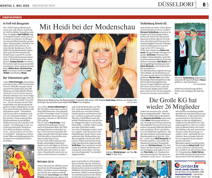Von New York ging es weiter nach Los Angeles. Dort besuchten die Niederberger/Pauk-Foleys unter anderem eine Modenschau von Bloomingdales im Beverly Hills Center. Dabei traf Daniela Pauk- Foley das deutsche Supermodel Heidi Klum. Das zweitbeste verdie- nende Model der Welt hatte ein wenig Zeit, seine Show „Germa- ny’s next Topmodel“ ist nämlich aufgezeichnet.