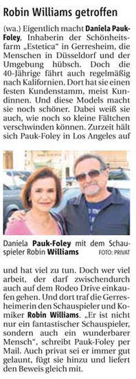 (wa.) Eigentlich macht Daniela Pauk-Foley, Inhaberin der Schönheitsfarm "Estetica" in Gerresheim, die Menschen in Düsseldorf und der Umgebung hübsch. Doch die 40-Jährige fährt auch regelmäßig nach Kalifornien. Dort hat sie einen festen Kundenstamm, meist Kundinnen. Und diese Models macht sie noch schöner. Dabei weiß sie auch, wie noch so kleine Fältchen verschwinden können. Zurzeit hält sich Pauk-Foley in Los Angeles auf und hat viel zu tun. Doch wer viel arbeitet, der darf zwischendurch auch auf dem Rodeo Drive einkaufen gehen. Und dort traf die Gerresheimerin den Schauspieler und Komiker Robin Williams. "Er ist nicht nur ein fantastischer Schauspieler, sondern auch ein wunderbarer Mensch", schreibt Pauk-Foley per Mail. Auch privat sei er immer gut gelaunt, fügt sie hinzu und liefert den Beweis gleich mit.